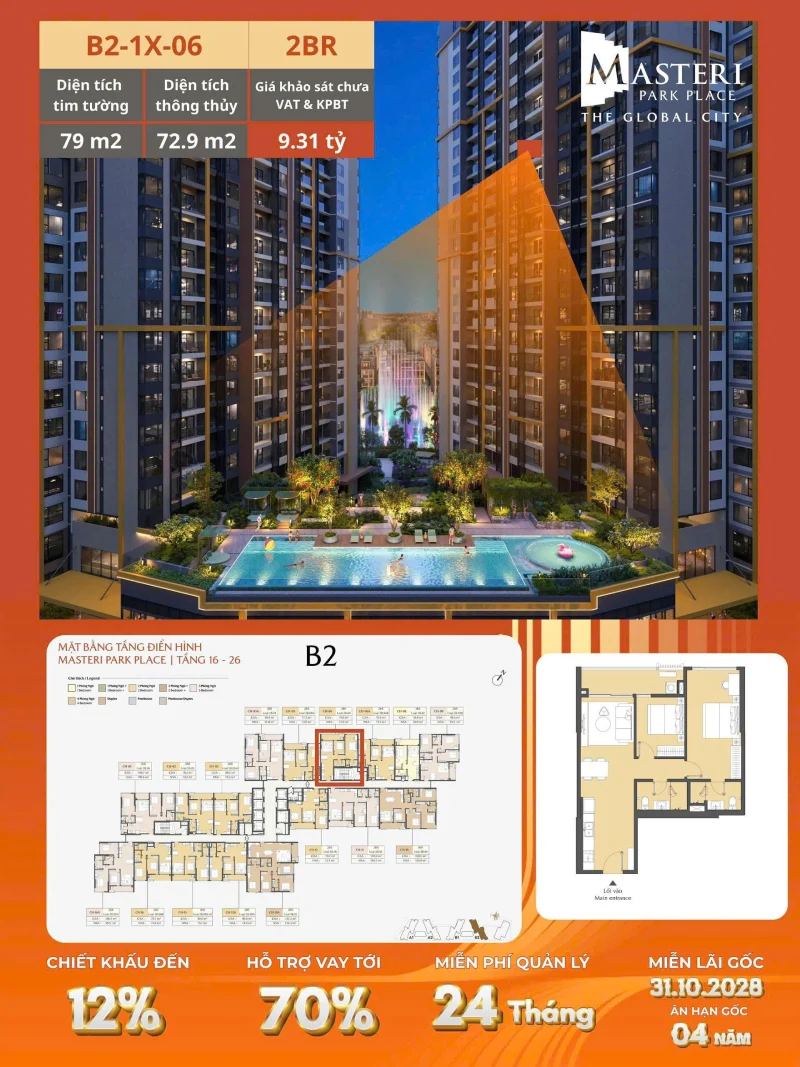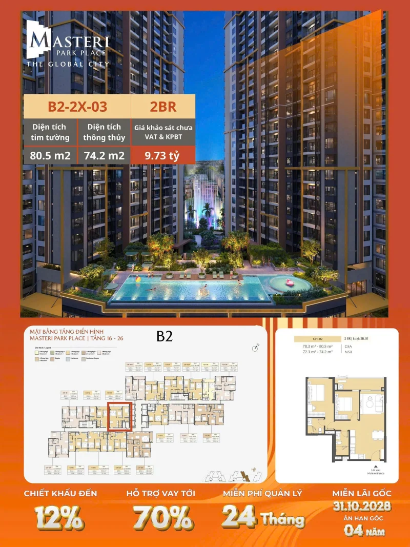 Mức giá khởi điểm cho căn 2PN tại tòa B2 dao động quanh mức 9.31 tỷ – 9.73 tỷ (chưa bao gồm VAT và Kinh phí bảo trì). Đây là mức giá phản ánh đúng vị thế của một sản phẩm bất động sản cao cấp, nằm trong khu đô thị đẳng cấp quốc tế The Global City, cùng với chất lượng xây dựng và tiện ích vượt trội từ Masterise Homes.