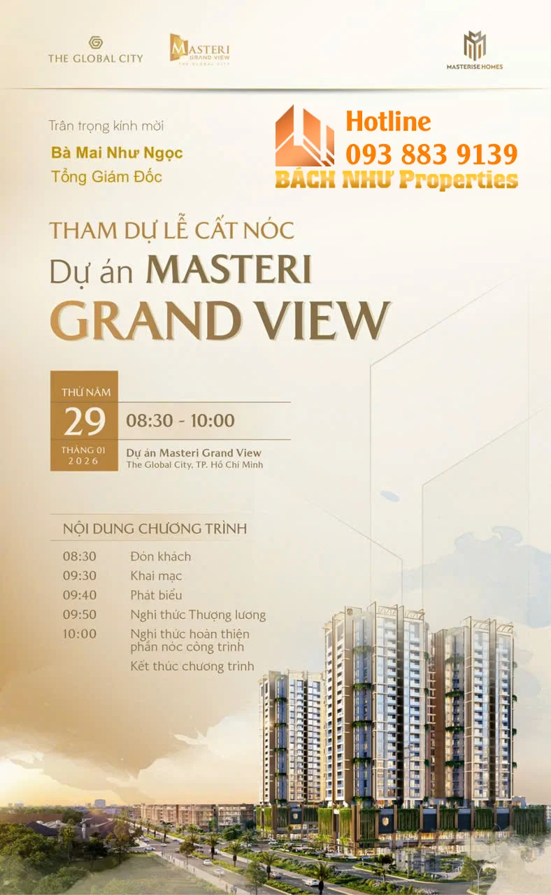 Ngày 29/01/2026, thị trường bất động sản khu Đông TP.HCM bùng nổ với sự kiện Lễ cất nóc Masteri Grand View tại đại đô thị The Global City. Đây là cột mốc quan trọng, minh chứng cho năng lực thi công thần tốc và cam kết vững chắc của Masterise Homes trong việc kiến tạo chuẩn sống quốc tế tại trung tâm mới của thành phố.